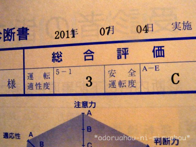総合評価の結果、運転適性度 3(5-1)、安全運転度 C(A-E)でした。